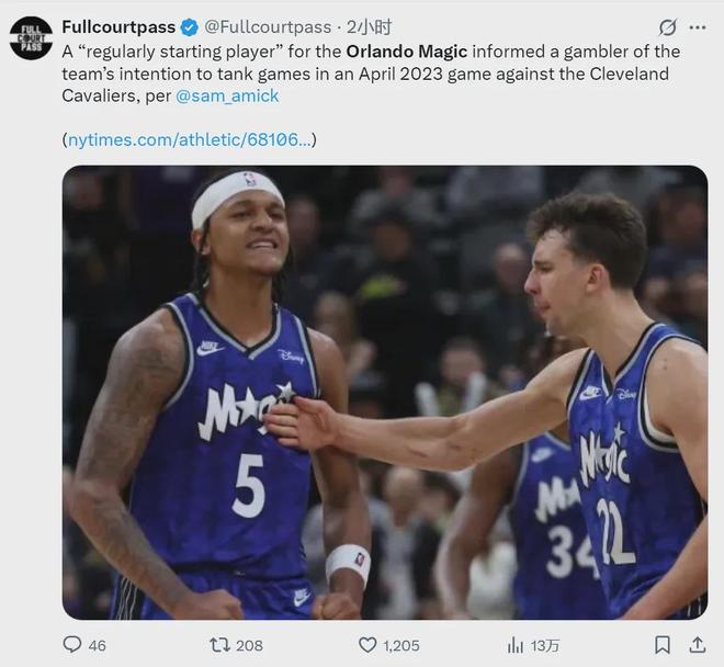 除了湖人之外,魔术也牵扯其中。The Athletic在报道中披露,2023年4月,魔术对阵骑士。当时一名魔术的“常规首发球员”告诉职业赌徒,魔术打算在这场比赛中摆烂,也就是不让主力上场。该球员姓名没公布,如今已经不在魔术。