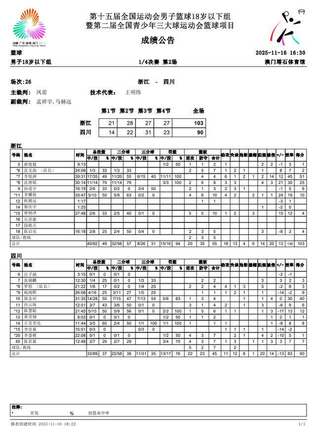 103-90!浙江U18男篮拒绝爆冷,凭借末节爆发,有惊无险地击败了四川队,顺利打进十五运U18男篮4强,会师山东队。李悦洲迎来爆发,此役独砍51分4篮板6助攻。四川队骆金州空砍40分。两人互飙,堪称神仙打架。