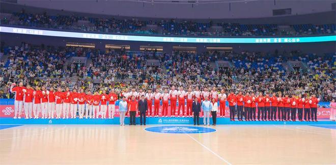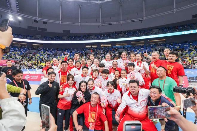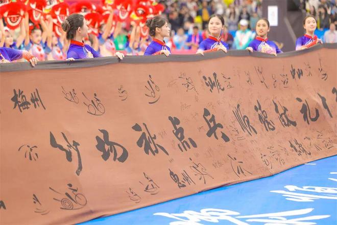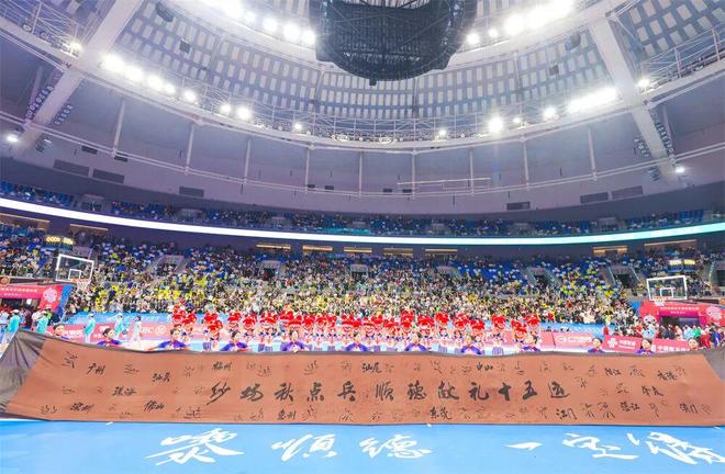 随后,36位萌娃化身的小醒狮引出承载着匠心与荣耀的香云纱长卷。这卷曾于开幕式惊艳亮相的工艺珍品,此刻已铭刻上十三支参赛队伍的签名,从一件艺术品升华为跨越山海的精神图腾。香云纱需经“三蒸九煮十八晒”方能淬炼成材,恰如女篮姑娘们在赛场上的每一次折返奔跑与精准投篮,历经磨砺,终放光华。
