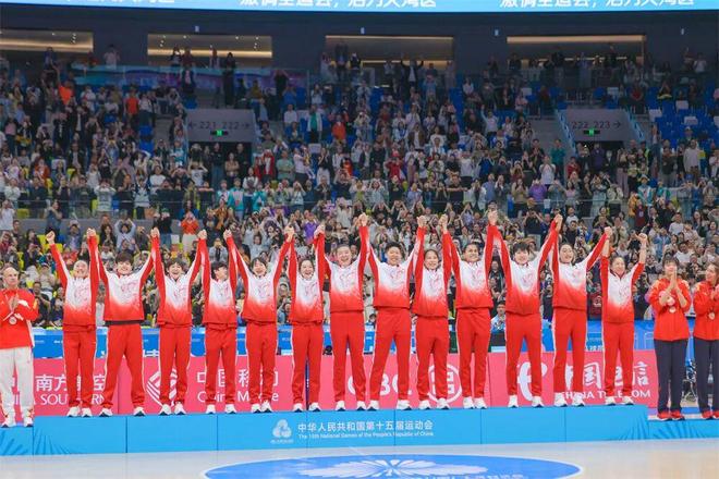 全运女篮成年组前三名合影。