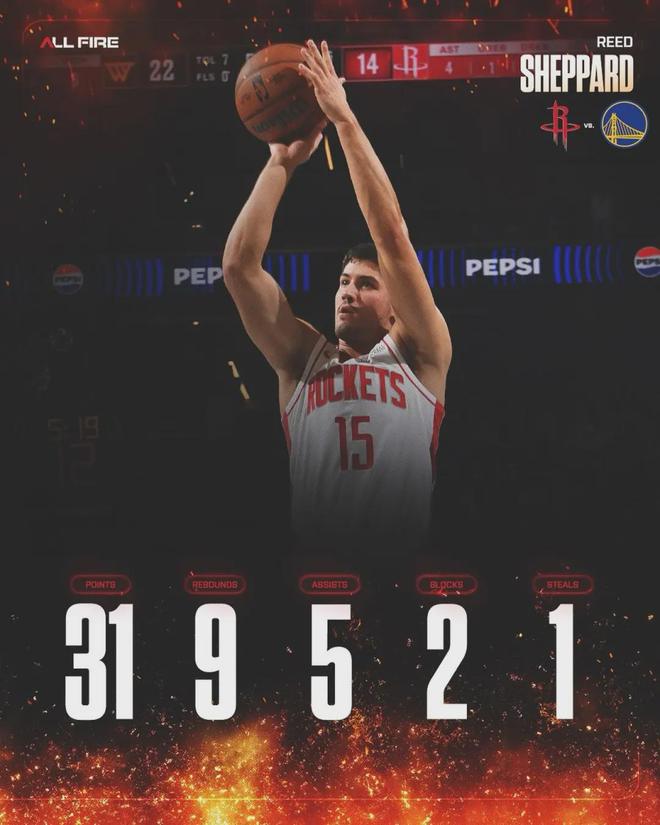 全场比赛,谢泼德25投12中、三分球12中4,砍下生涯新高的31分,外加9篮板5助攻1抢断2盖帽,成为火箭逆转战胜勇士的最大功臣。