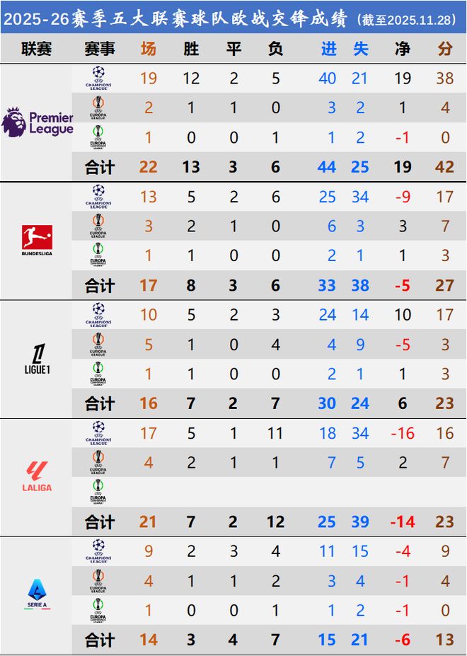 这是欧冠欧联第五轮(欧协联第四轮)结束后,五大联赛球队的整体成绩: